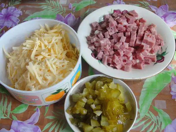 Огурчики можно заменить маринованным луком или оливками. Ветчину и огурцы порежу на кусочки, сыр натру на тёрке.