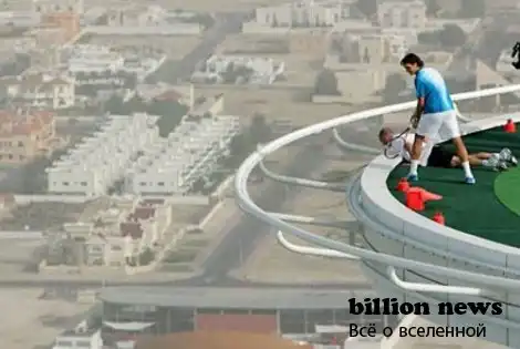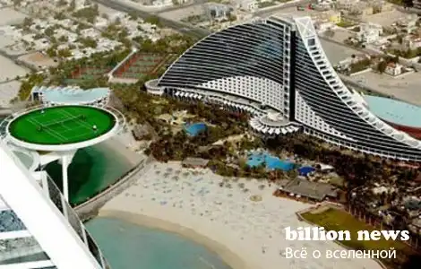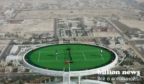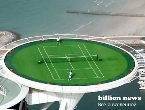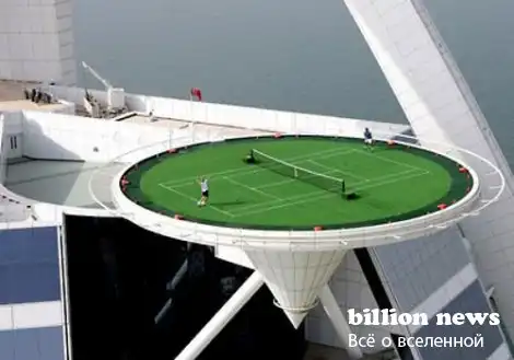 В интервалах между теннисными матчами, корт используется как посадочная площадка для вертолетов. Кстати, помимо теннисного корта, на крыше отеля располагаются бассейны и прекрасные сады.