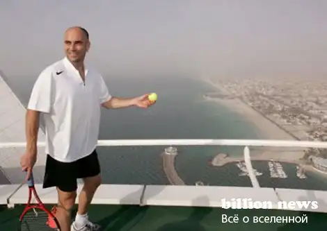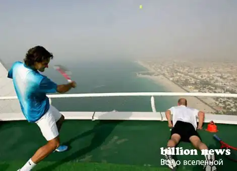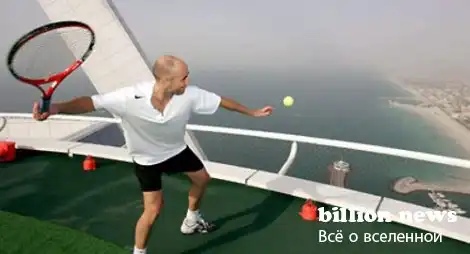На фотографиях ниже, на этом головокружительном корте, в теннис играют Андре Агасси и Роджер Федерер.