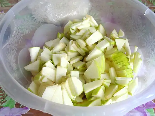 Яблоки тонко нарежу. Достаточно двух крупных яблок, или 4 небольших.