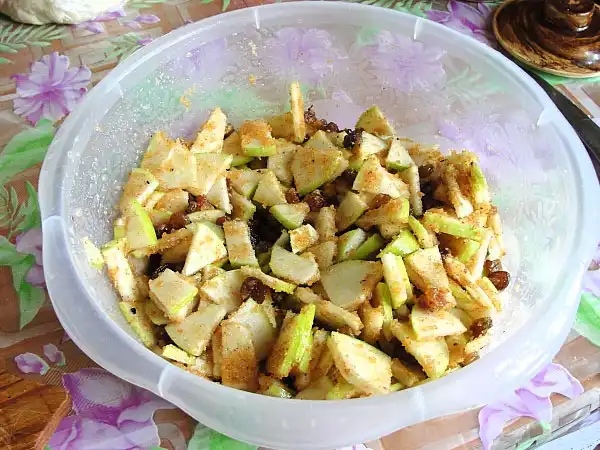 Яблоки полью лимонным соком, присыплю сахаром и корицей. Добавлю изюм и сухари, перемешаю.