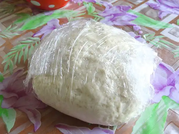 Теперь смажу тесто растительным маслом и заверну в пищевую плёнку.