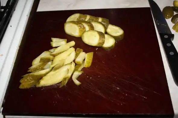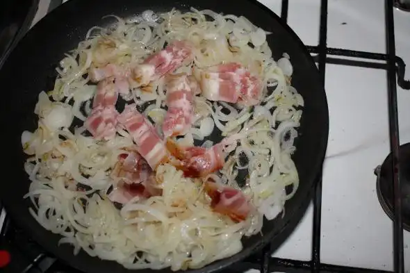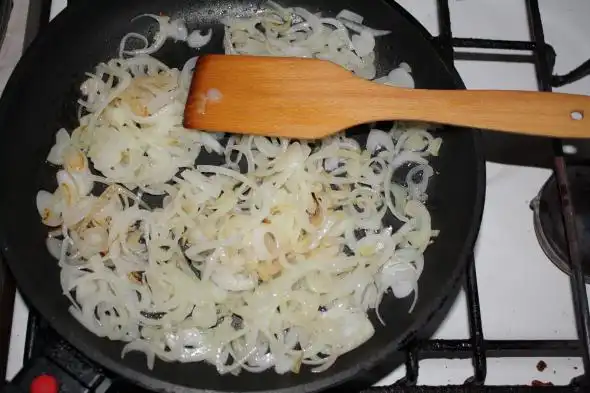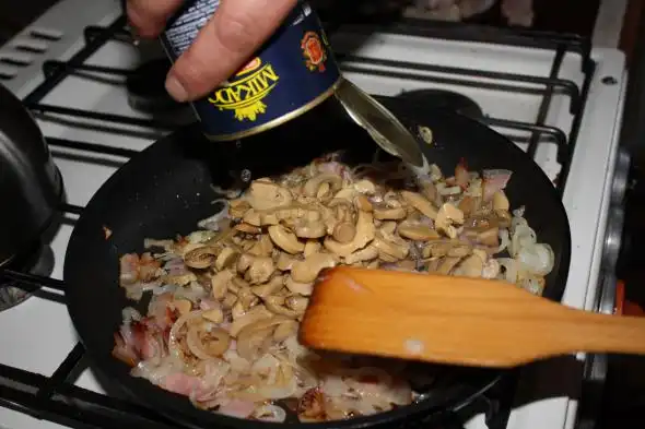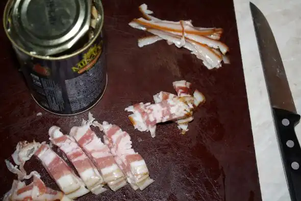 Пока обжаривается лук, открываем грибы и мелко режем свинину...