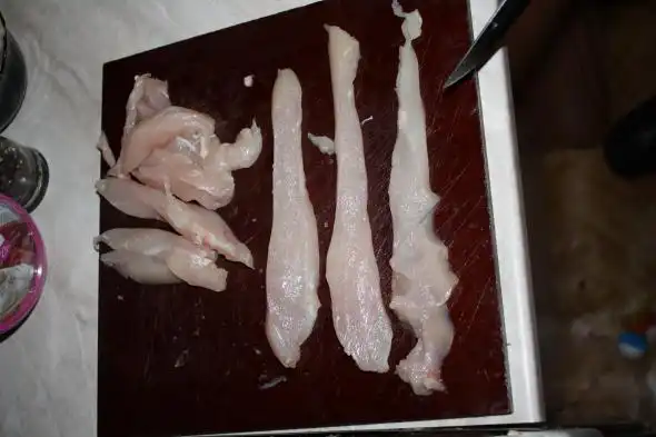 Нарезаем филе кусочками примерно с фалангу указательного пальца...