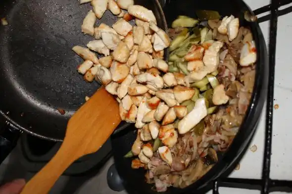 Кусочки филе обжариваем до золотистой корочки на сильном огне и соединяем с остальными ингредиентами...