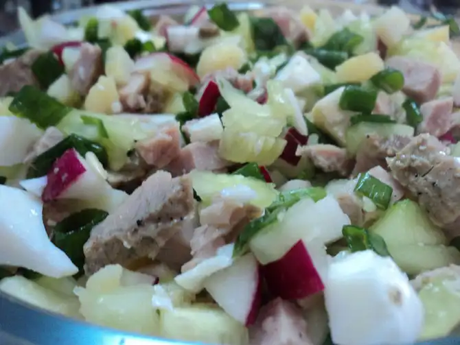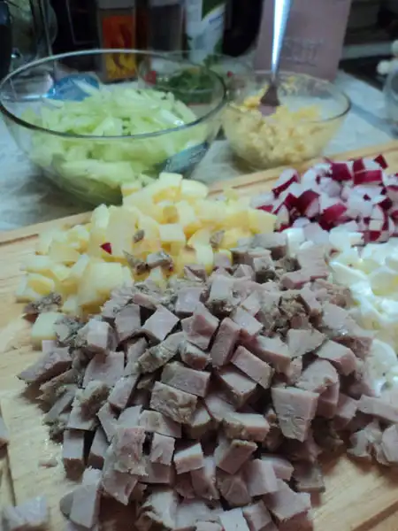 Белки яиц, редис, картофель, мясо нарезаем мелкими кубиками