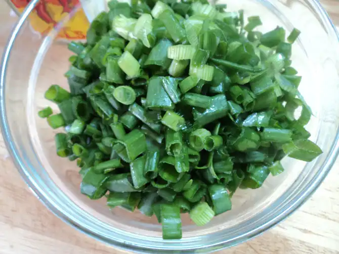 Шинкуем зеленый лук, присыпаем солью и очень нежно перетираем руками. Лук нужно шинковать мелко, но у меня не получилось. Уж больно лук такой попался крепкий. Жалко было мельчить.