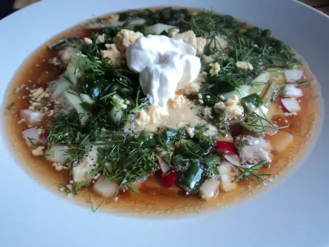Выкладываем порционно в тарелки, заливаем холодным квасом, присыпаем яйцом с горчицей (в зависимости от любви к острому) и добавляем сметану.