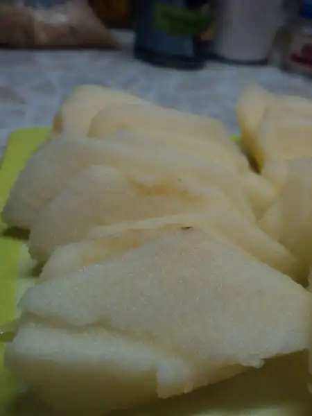 Яблоки очищаем от кожуры и нарезаем тонкими ломтиками.