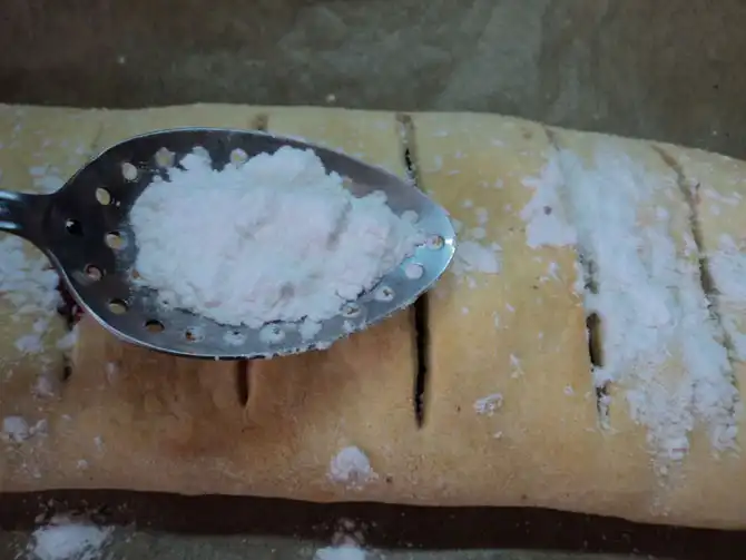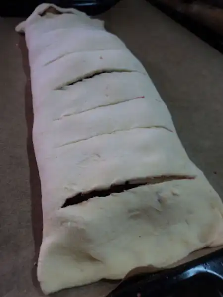 Сворачиваем рулет слегка «внахлест». Очень аккуратно выкладываем швом вниз на пергамент. Защипываем боковые края. Делаем надрезы ножом на расстоянии 5 см. Это поможет начинке лучше пропечься, выйдет пар, да и на порции будет потом легче резать. Ставим в разогретую до 180 градусов духовку на полчаса.