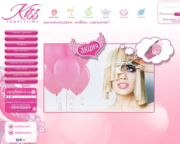 У сигарет Kiss есть свой промо-сайт, разумеется. Тоже весь зубодробительно розовый — Kiss-club. “Донской Табак” обезопасил себя: при входе на сайт надо подтвердить, что тебе есть 18 лет, таков закон. Но законы, тем более такие легко обходимые, непроверяемые и с микроскопической возможность доказать нарушение, писаны не для подростков с их духом протеста и прочими присущими чертами. Никто не мешает им ткнуть на “да”.