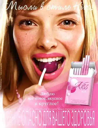 Здесь, конечно, можно возразить и сказать, что этот дизайн нельзя однозначно отнести к подростковому. Но рекламу «взрослой» тоже не назовешь. Этим летом Ассоциация рекламодателей обратилась в антимонопольную службу с просьбой обратить внимание на рекламу Kiss. На принте была изображена молодая девушка с леденцом во рту, а ниже пачка с сигаретами, по форме напоминающими конфету, и выглядящая как упаковка сладостей. В верхней части копилайн — «Мысли в стиле Kiss!», в нижней части — «Люблю все новое, вкусное и круглое!». Реклама была размещена в глянцевых журналах, аудиторией которых являются девушки в нежном возрасте 16—17 лет.