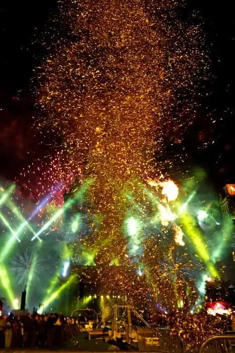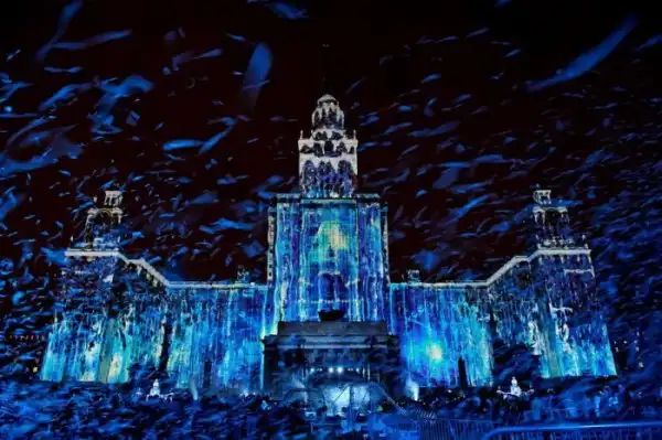 Шоу закончилось грандиозным фейерверком как настоящим, так и проецируемым на здание.