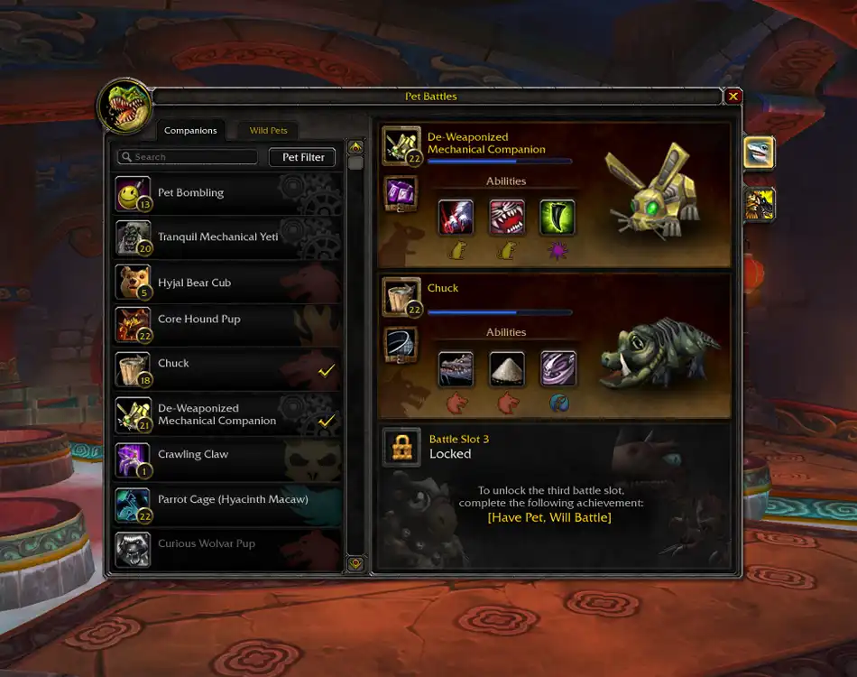 Еще одним нововведением в Mists of Pandaria будет система сражений между небоевыми спутниками. Принцип работы этой системы будет напоминать принцип работы второстепенных профессий, которыми может заниматься кто угодно. Игроки получат возможность использовать уже имеющихся небоевых спутников или ловить новых, растить их и выставлять на бой против питомцев других игроков.