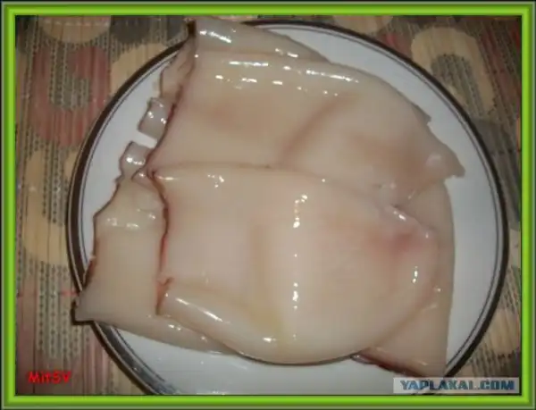 Кальмары очищаем от кожи (лучше до конца не размораживать, тогда кожа легче очищается), от внутренностей. Вынимаем хребет. Щупальцы (или это голова, х.з.) отделяем и убираем (можно сделать потом салат из них). Хорошо промываем под холодной водой.