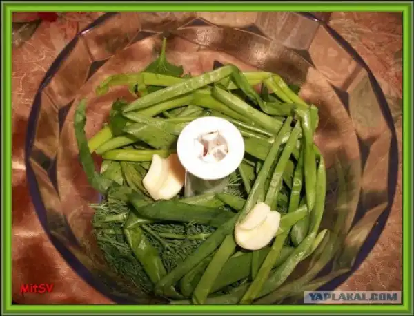 Зелень (укроп, петрушку, зеленый лук) и 1 дольку чеснока измельчаем либо ножом очень мелко, либо в блэндере
