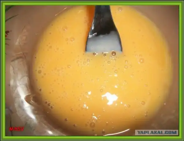 3. Перемешиваем и добавляем муку, постоянно перемешиваем. Примерно должна быть консистенция кляра, как на оладушки, даже немного гуще. Далее взбиваем белки и вливаем в кляр, перемешиваем и всё, кляр тоже готов. Качество фотки хреновое, уж так получилось.