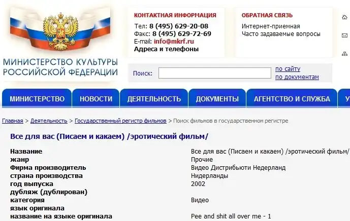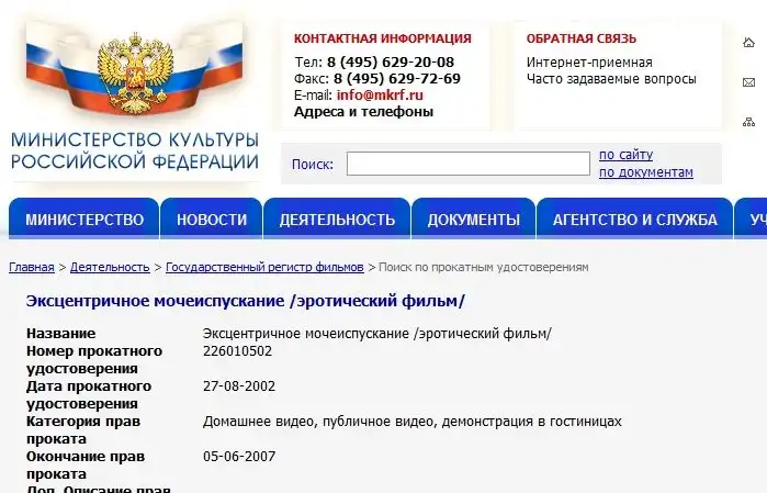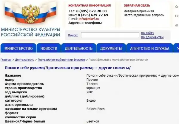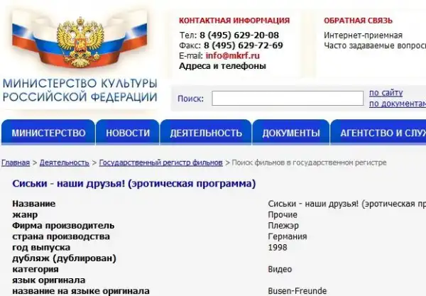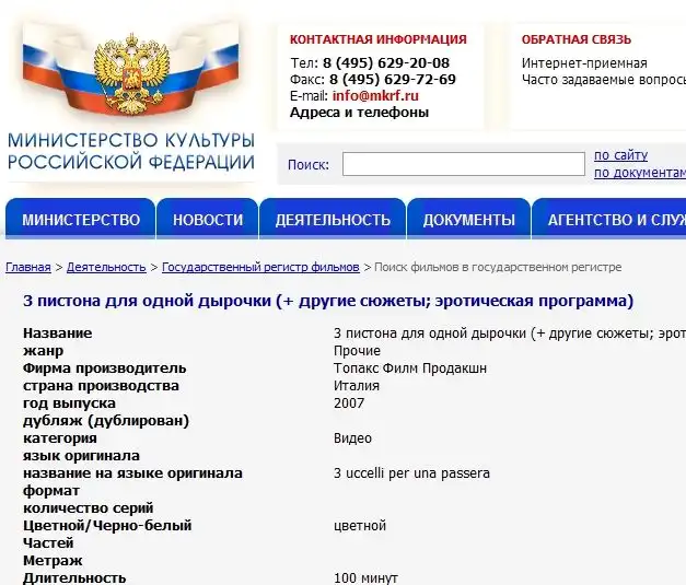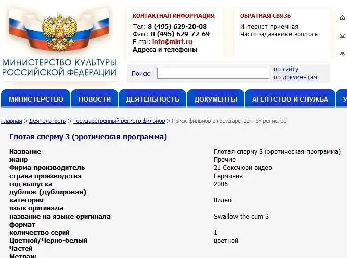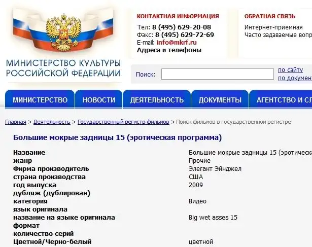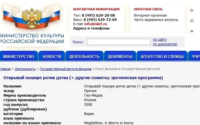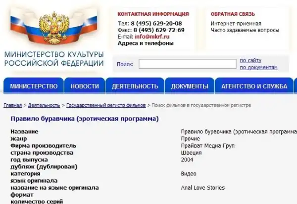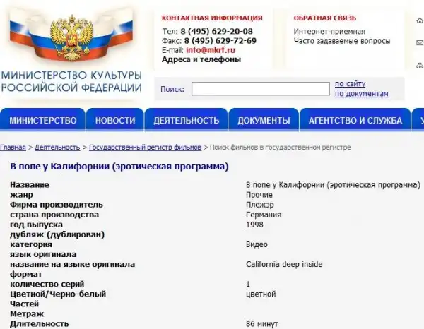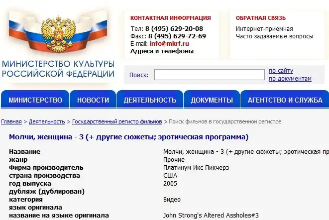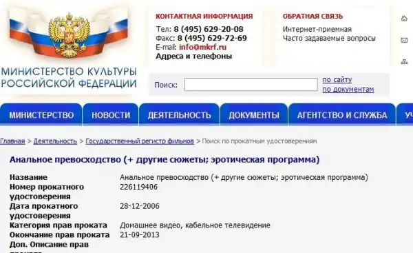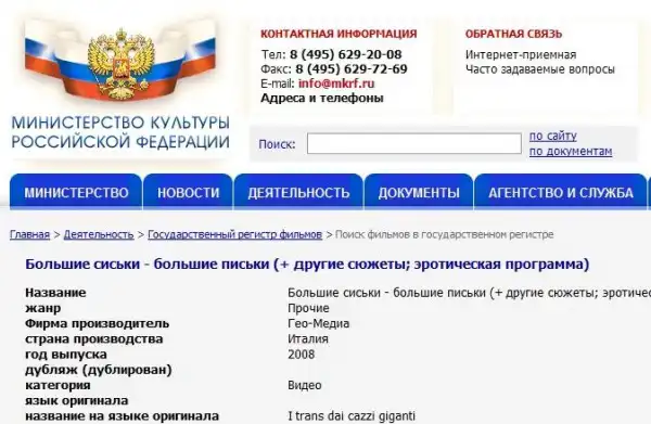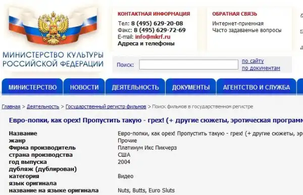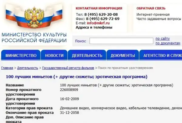 Перед вами фильмы, которым Министерство Культуры Российской Федерации выдало прокатное удостоверение. Если вы вдруг думали, что в России порнография не совсем легальна, то вы ошибаетесь. На сайте Министерства Культуры Российской Федерации собраны все кастинги Пьера Вудмана и фильмы Рокко Сиффреди.