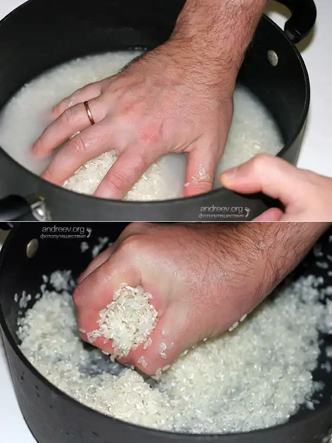 2. Слить почти всю воду. Снова помешивать и отжимать рис рукой уже сильно, но аккуратно, не ломая, в течении 10 секунд. Залить свежей водой, отжать, слить. Повторить еще один-два раза, вода должна стать почти прозрачной. Осушить.