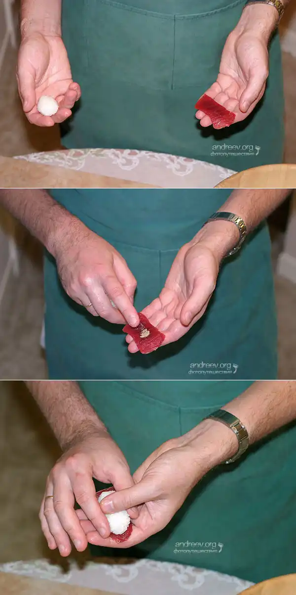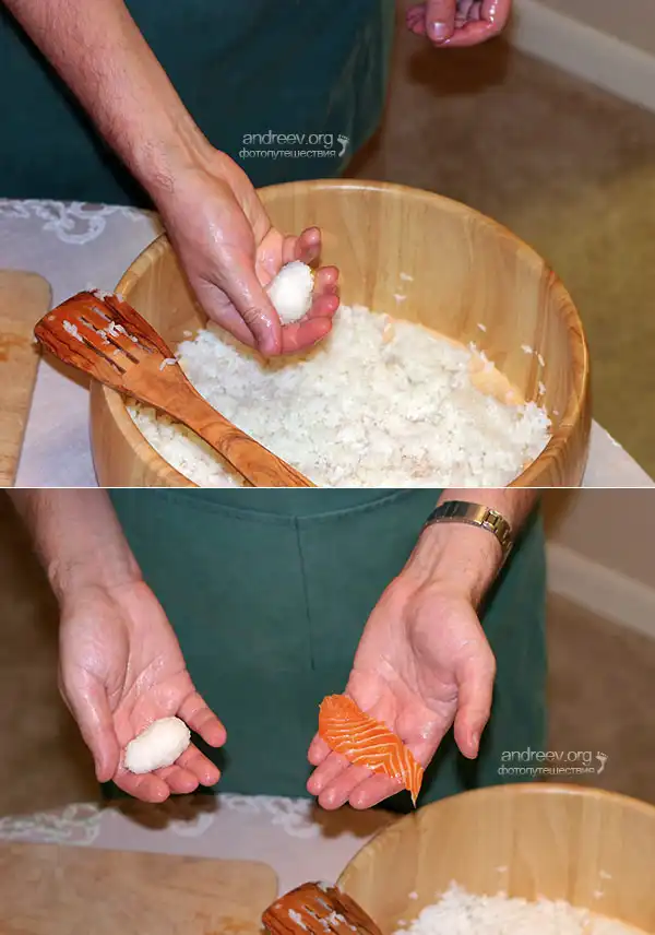 Указательным пальцем правой руки зачерпните немного васаби (не выпуская рисовой заготовки из ладони), и слегка промажьте кусок рыбы. Поверх положите рис. Большим пальцем левой руки слегка нажмите на рис сверху, оставив почти незаметную вмятинку. Теперь смените руки, и надавите более сильно на всю поверхность риса указательным и средним пальцами правой руки.