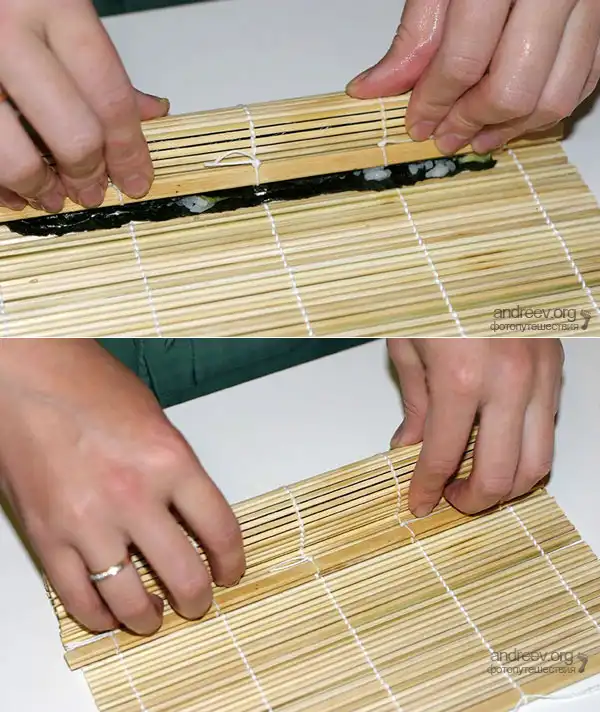 Удерживая все ингредиенты, поднимите край коврика с помощью больших пальцев, и продолжайте поднимать его вверх и вперед, пока край коврика не коснется противоположного края водоросли. Затем, загните край коврика наверх, и "докатите" ролл вперед. Слегка сожмите его внутри коврика, придавите пальцами с торцов, если выпал рис. Отложите на гладкую поверхность, и приступайте к изготовлению следующего.
