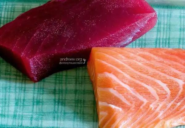 Сырая свежая рыба: филе лосося (саке) и тунца (магуро). Рыба ни в коем случае не должна быть ни разу заморожена! Желательно покупать специально предназначенную для суши в японских магазинах, с пометкой "sushi grade".