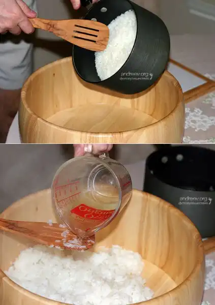 5. Соединение заправки с рисом. Горячий рис выложить в широкий контейнер ровным слоем, вылить на него заправку тонкой струйкой по лопатке, и незамедлительно начать мешать. Поднимать рис деревянной лопаточкой снизу вверх и справа налево. Собрать весь рис на половину контейнера, и потихоньку начать переправлять его небольшими порциями на другой край, делая горизонтальные, режущие (не размешивающие!) движения деревянной лопаткой. Такое бережное обращение позволит пропитаться заправкой каждому рисовому зернышку. Повторить так несколько раз. Распределить рис равномерным слоем по дну контейнера. Накрыть влажным бумажным полотенцем, и оставить охлаждаться.