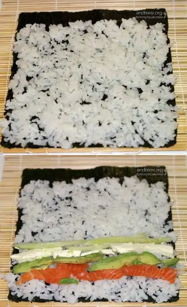 2. Толстые роллы (футо-маки). Толстые роллы, диаметром 5 см, могут содержать до 5 компонентов. Для их изготовления возьмите целый лист водоросли, положите на коврик блестящей стороной вниз. Смочите руки уксусной водой и равномерно распределите рис по водоросли, оставив с верхней стороны свободными около 2 см. По желанию, промажьте рис неострым майонезом.