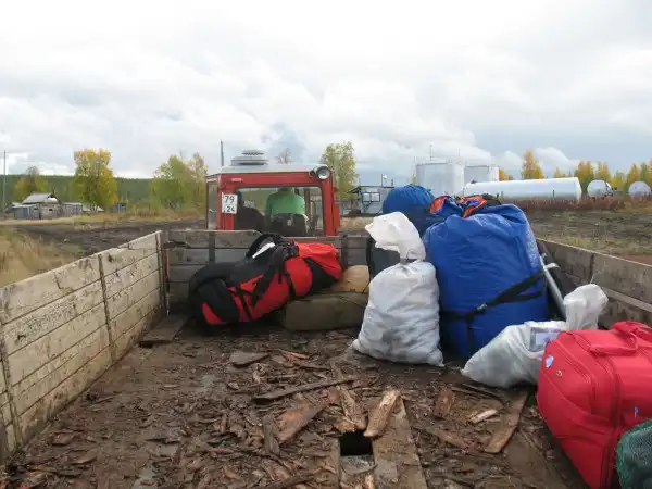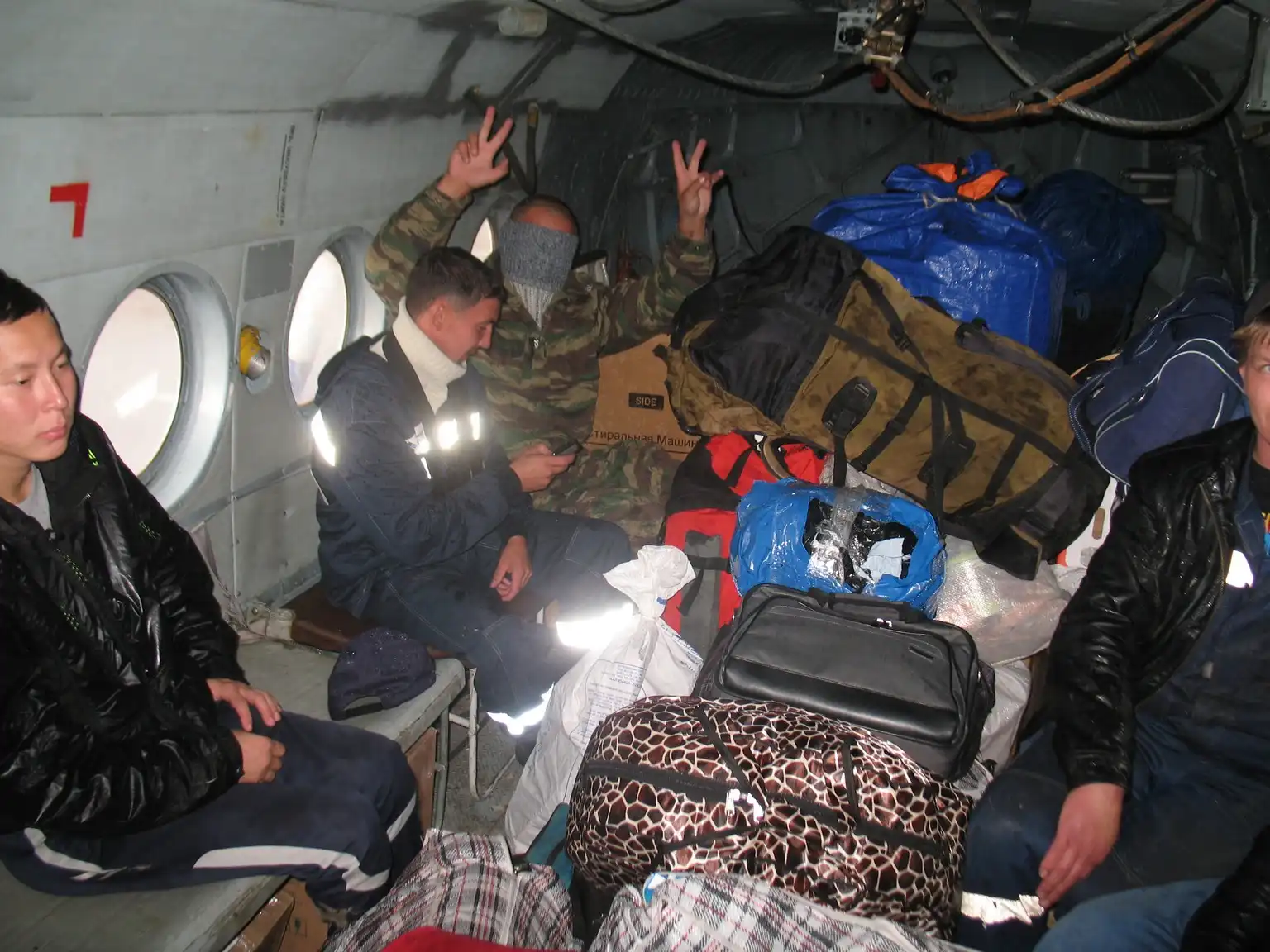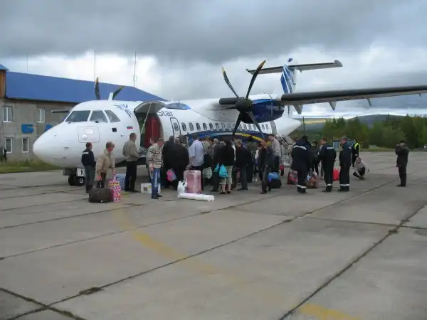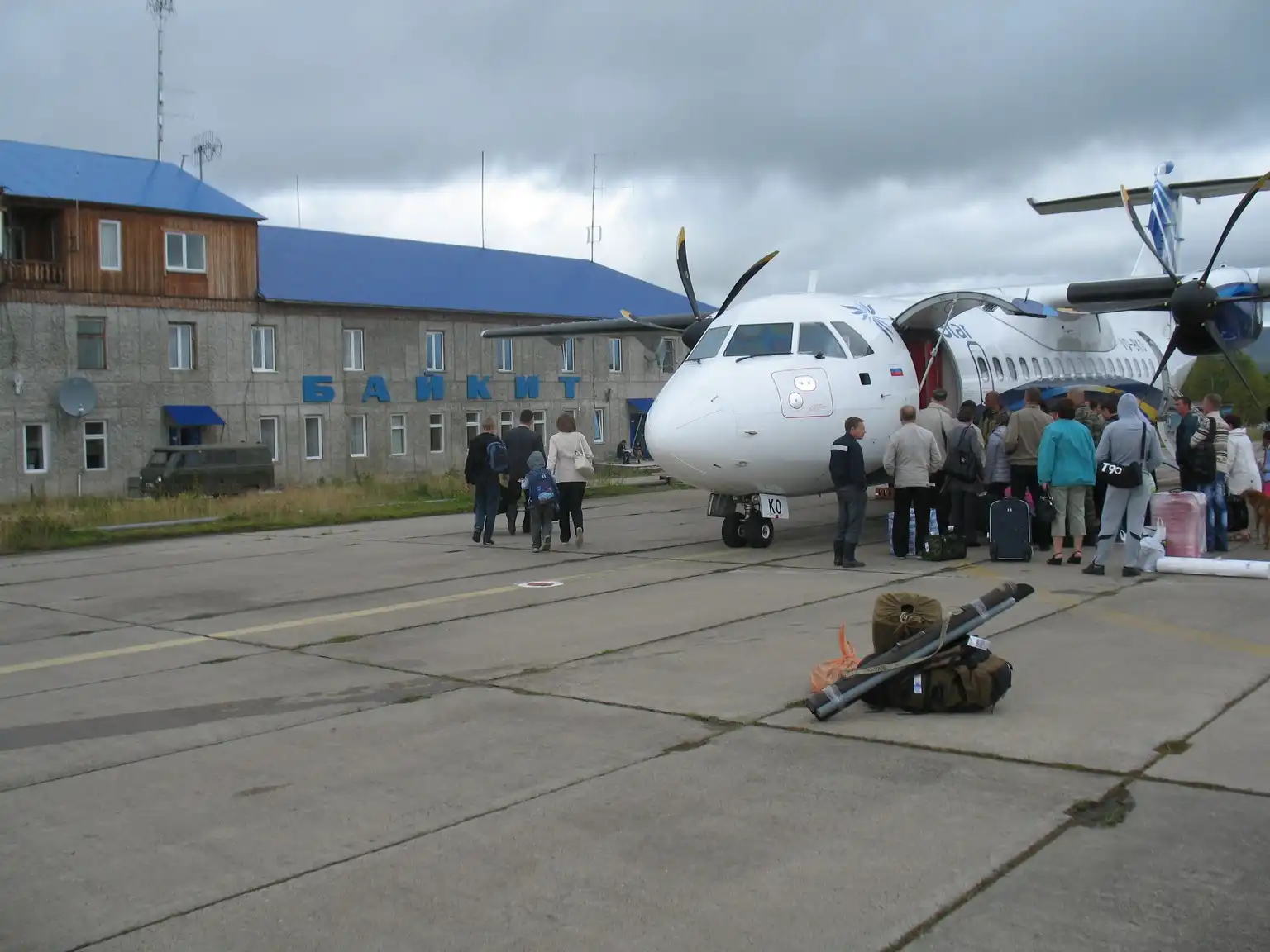 Разгрузка багажа происходит силами пассажиров, это вам не Домодедово, в п. Байкит только так