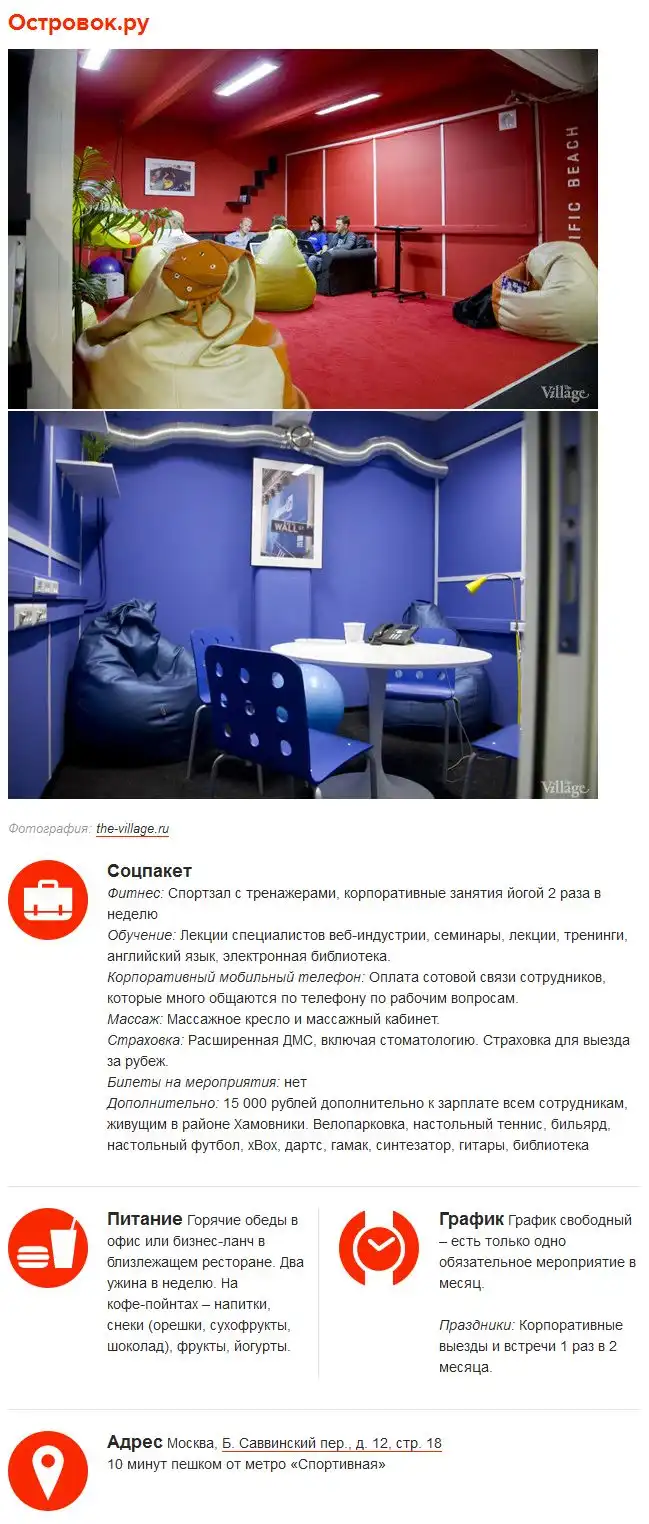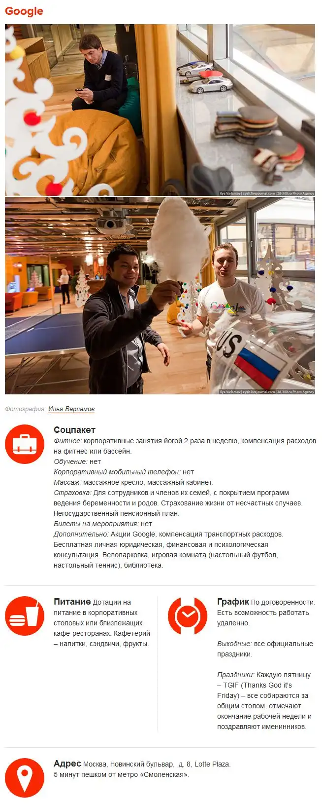 Сегодня я хочу вам показать, какие блага вас будут ждать, если вам повезет устроиться в одну этих перечисленных интернет-компаний. Комфортные условия работы, социальная защищенность, хороший коллектив - несомненно, являются залогом здорового роста и процветания бизнеса.