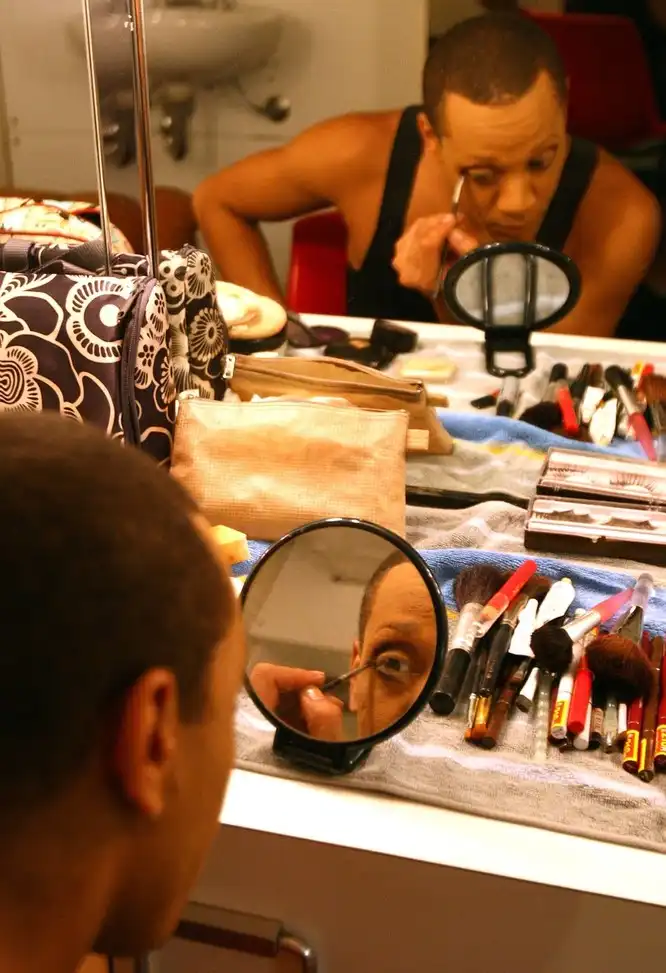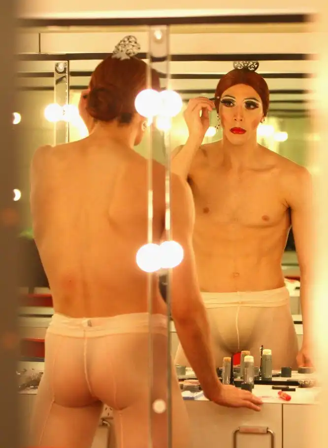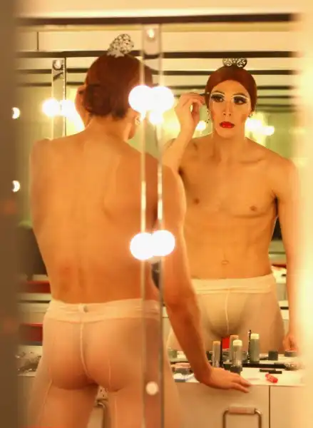 Танцовщики на сцене очень ярко передают всю галерею женских характеров. Перед тем, как предстать перед публикой в образе героини балетной постановки, мужчины тщательно готовятся. На фото: танцовщик Трокс поправляет макияж перед выступлением.