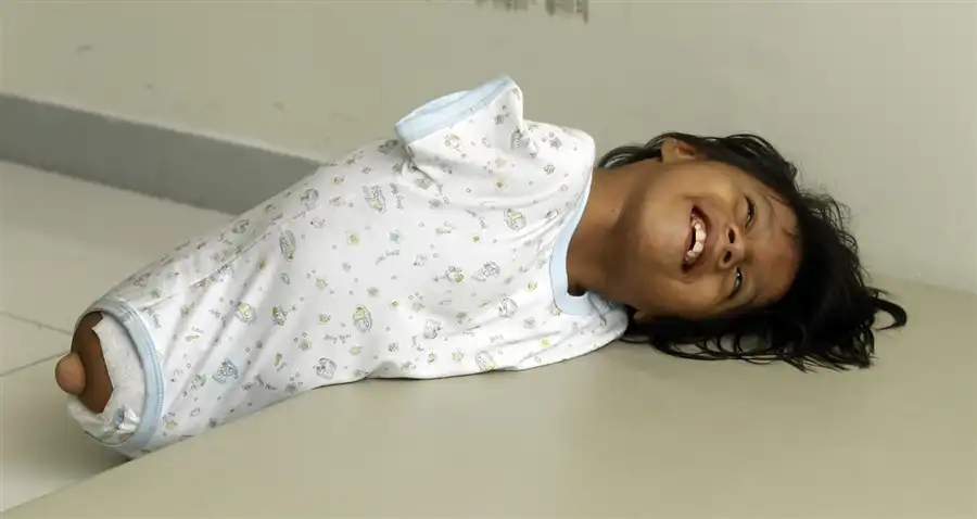 Медицинский работник с восьмилетней Йованой Йумбо Руис, которой диагностировали синдром Тетра-Амелия, в клинике Ла Луз в Лиме, 29 ноября 2011 года.