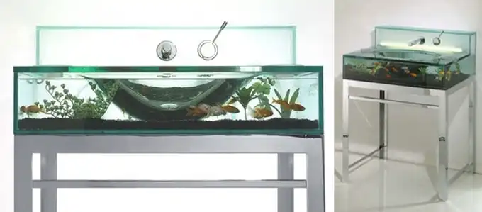 Внутренний декор в ней может меняться благодаря съемной верхней части. Для кормления рыб есть два отверстия с каждой стороны. Также раковина обрудована системой фильтрации воды и подсветкой.