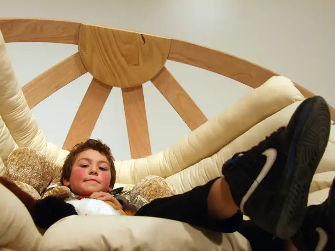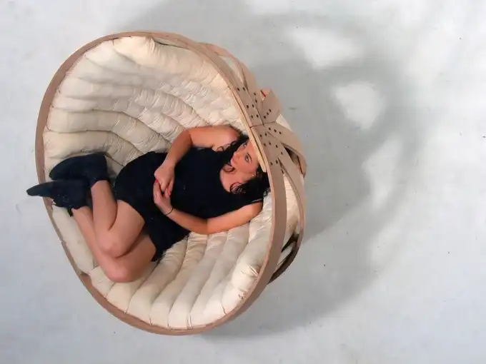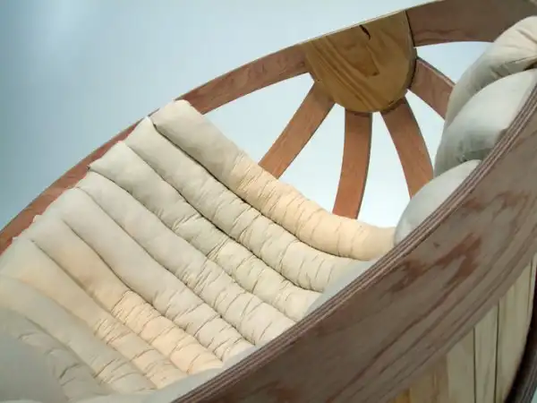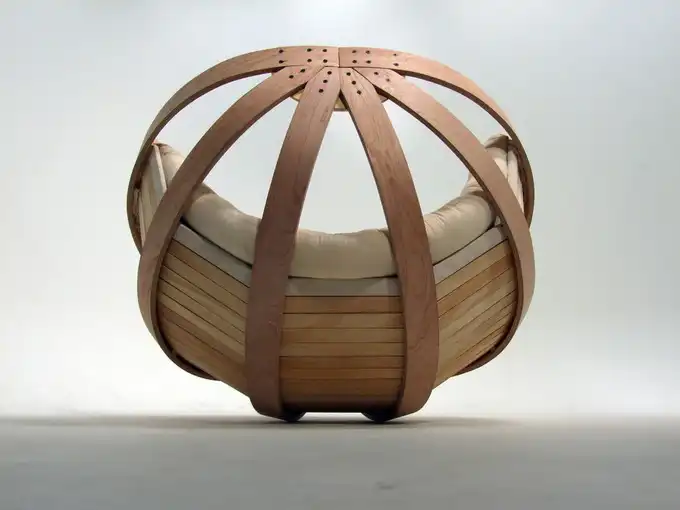 Оригинальное кресло-качалку создали дизайнеры из Новой Зеландии - Richard Clarkson, Grace Emmanual, Kalivia Russel, Eamon Moore, Brodie Cambell, Jeremy Brooker, Joya Boerrigter. Кресло напоминает колыбель, а сделано по принципу изготовления каркаса лодки - из согнутых брусков фанеры.