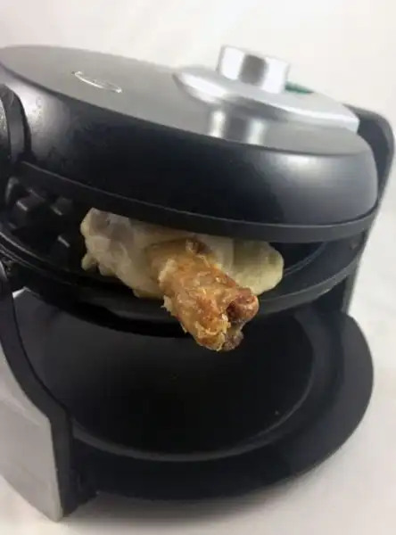Очень просто, обмакиваем куриную ножку в тесте для вафель и запекаем :)