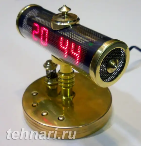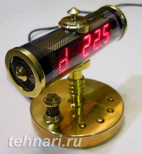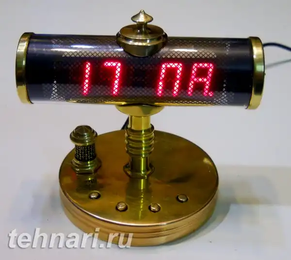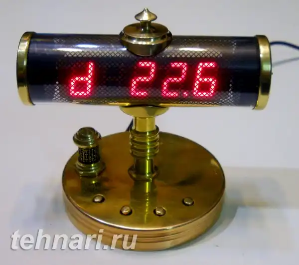 Отличий не очень много: добавились кнопки, боковины пришлось сделать сетчатыми для выхода звука будильника, и на подставке появился отсек для датчика температуры, он тоже сделан из сеточки. Часы могут показывать домашнюю и уличную температуру, имеют пять будильников и календарь.
