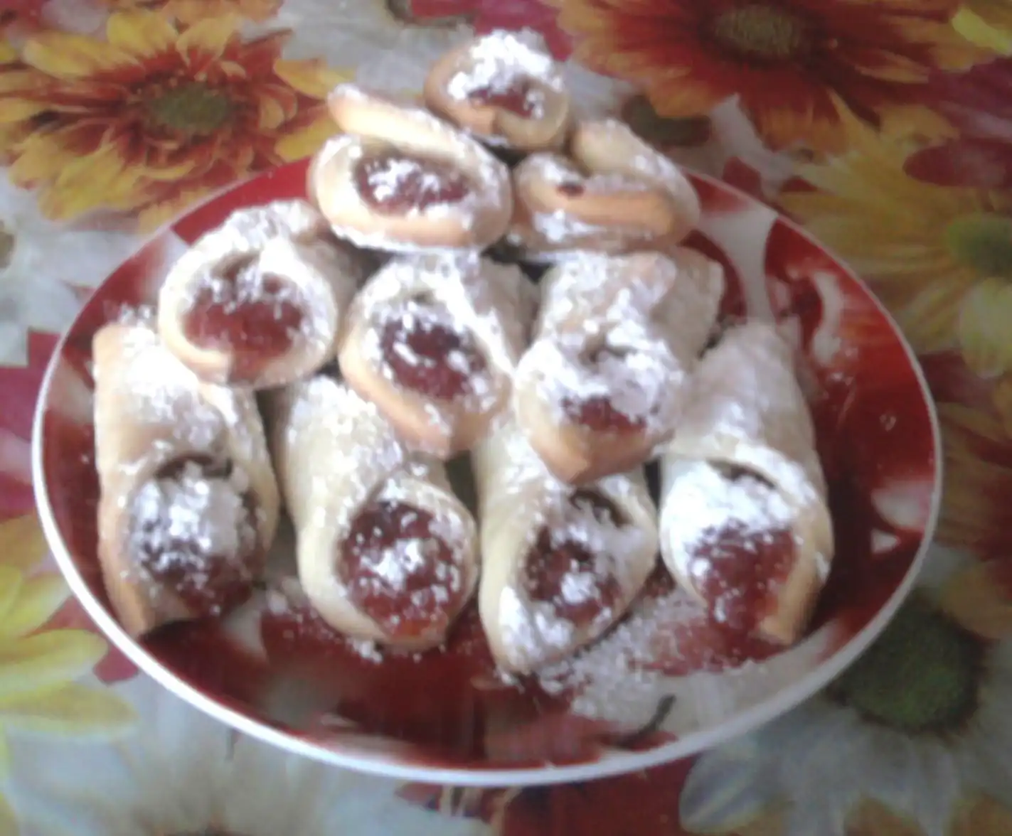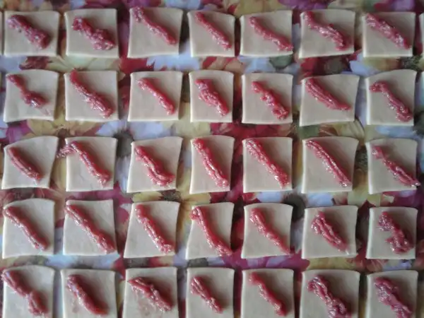 Чтобы удобней было раскладывать повидло, можно воспользоваться кондитерским шприцем, если его нет, то просто полиэтиленовым пакетом у которого срезан один уголок. Печенье будет вкуснее если повидло слегка кислит, этого можно добиться, примешав к повидлу немного лимонной кислоты растворенной в небольшом количестве воды или лимонного сока. (ВНИМАНИЕ! Ни в коем случае не берите в магазине для начинки джем, он плавится и растекается по всему листику. Можно купить яблочное или абрикосовое повидло).