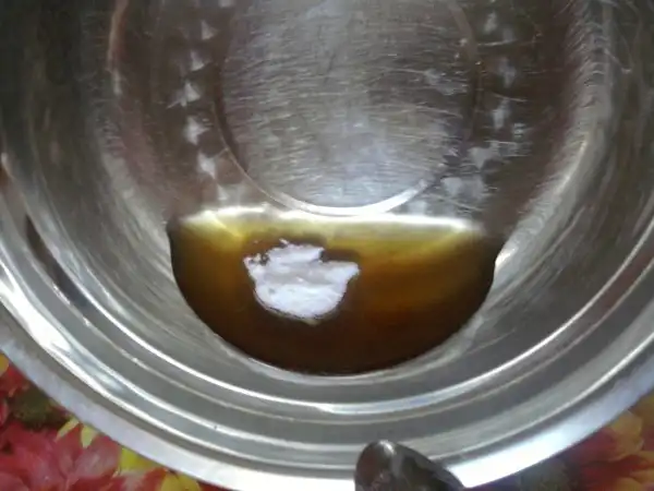 Добавляем в мед 1/2 чайной ложки соды и растираем до цвета сгущенного молока. Мед необязательно должен быть жидкий и прозрачный.