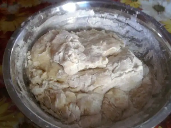 Добавляем муку небольшими порциями и замешиваем тесто. Замешивать можно ложкой, но когда станет трудно месить ложкой - месим руками.