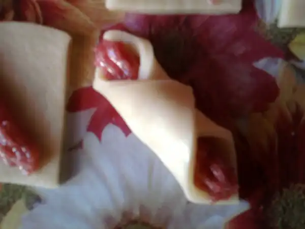 Раскатанное тесто режем на квадраты 7х7 см. Обращаю ваше внимание, что после разрезки тесто слегка сжимается. Обрезки убираем в пакет к оставшемуся тесту. Раскладываем повидло. С помощью ножа заворачиваем вот такие вот "конвертики".