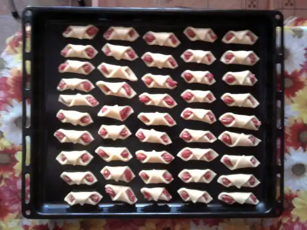 Выкладываем "конвертики" на листик. Поскольку тесто жирное, то печенье не прилипнет, однако, если сомневаетесь, то можно смазать листик небольшим количеством сливочного масла. Я не смазываю.