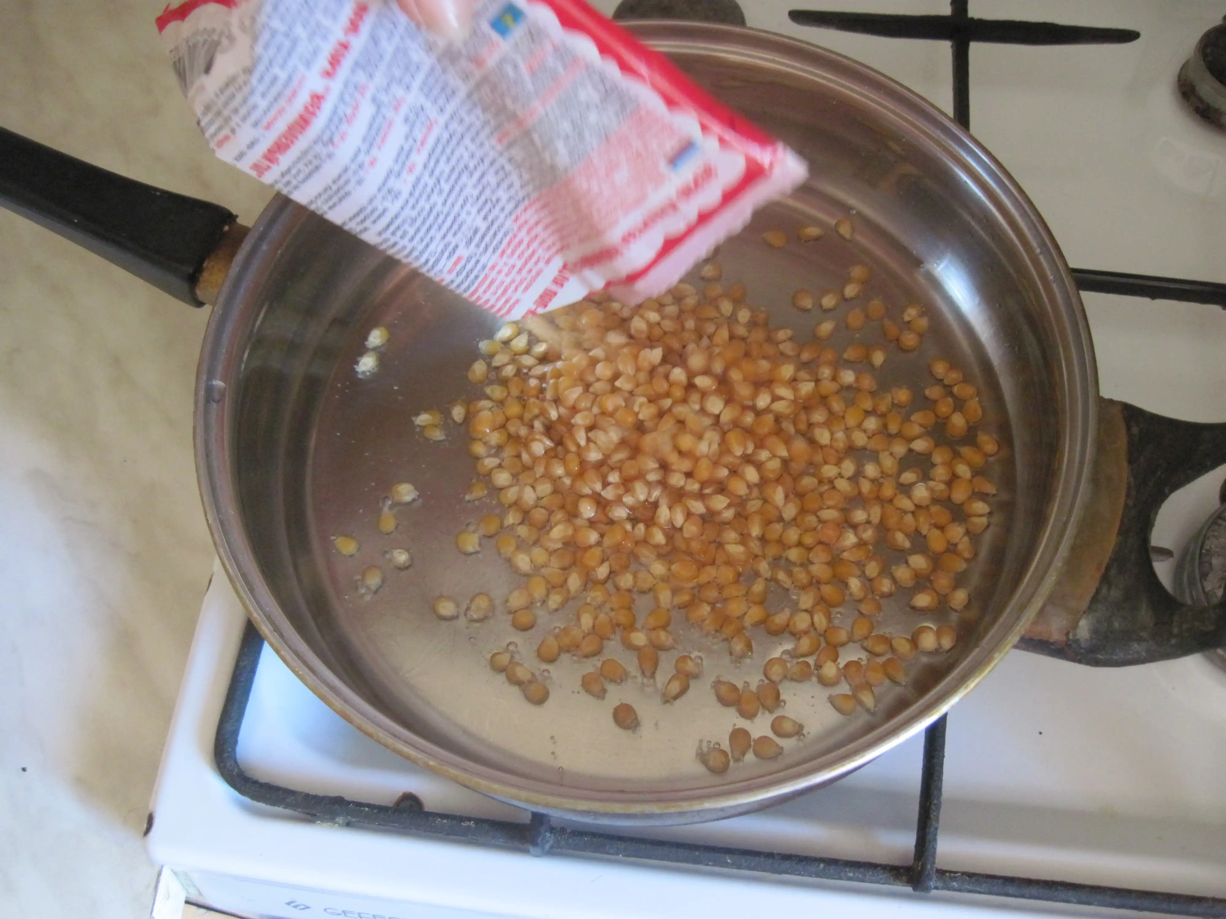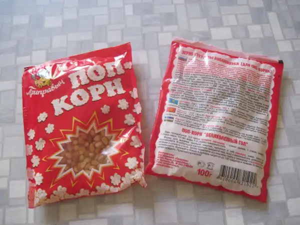 ИТАК, для начала вам предстоит самое сложное и дорогое мероприятие из этого действа - найти и купить зерно кукурузы лопающейся (для поп-корна). Она не во всех магазинах продаётся, но найти можно.Стоит одна пачка около 10 рублей.Ну вот самое главное почти позади.