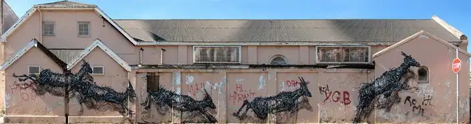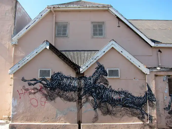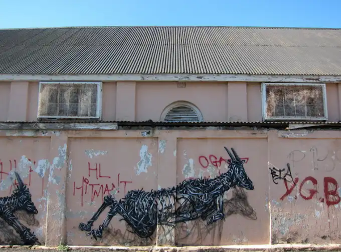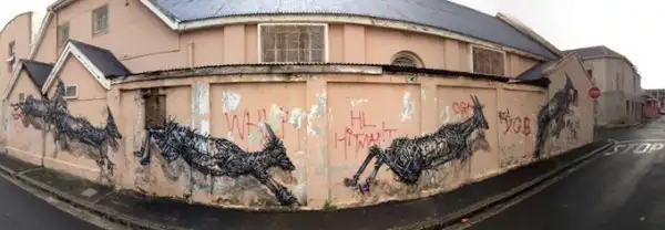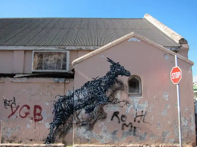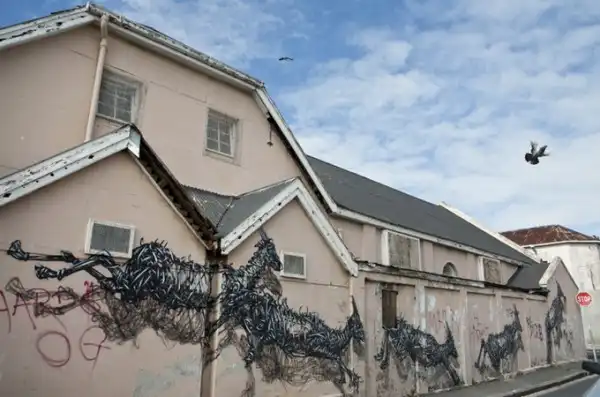 Китайский уличный художник DAL разрисовал стены одной из улиц Кейптауна (ЮАР). Его новая фреска называется "The Williams Brothers". DAL использовал только черно-белую краску, что полностью в его стиле, чтобы изобразить движение антилопы вдоль улицы и за угол.