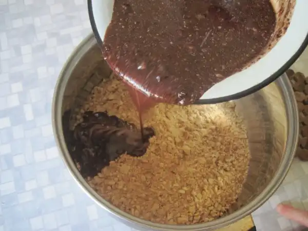 В получившуюся массу добавить смесь из масла, сгущенки и какао