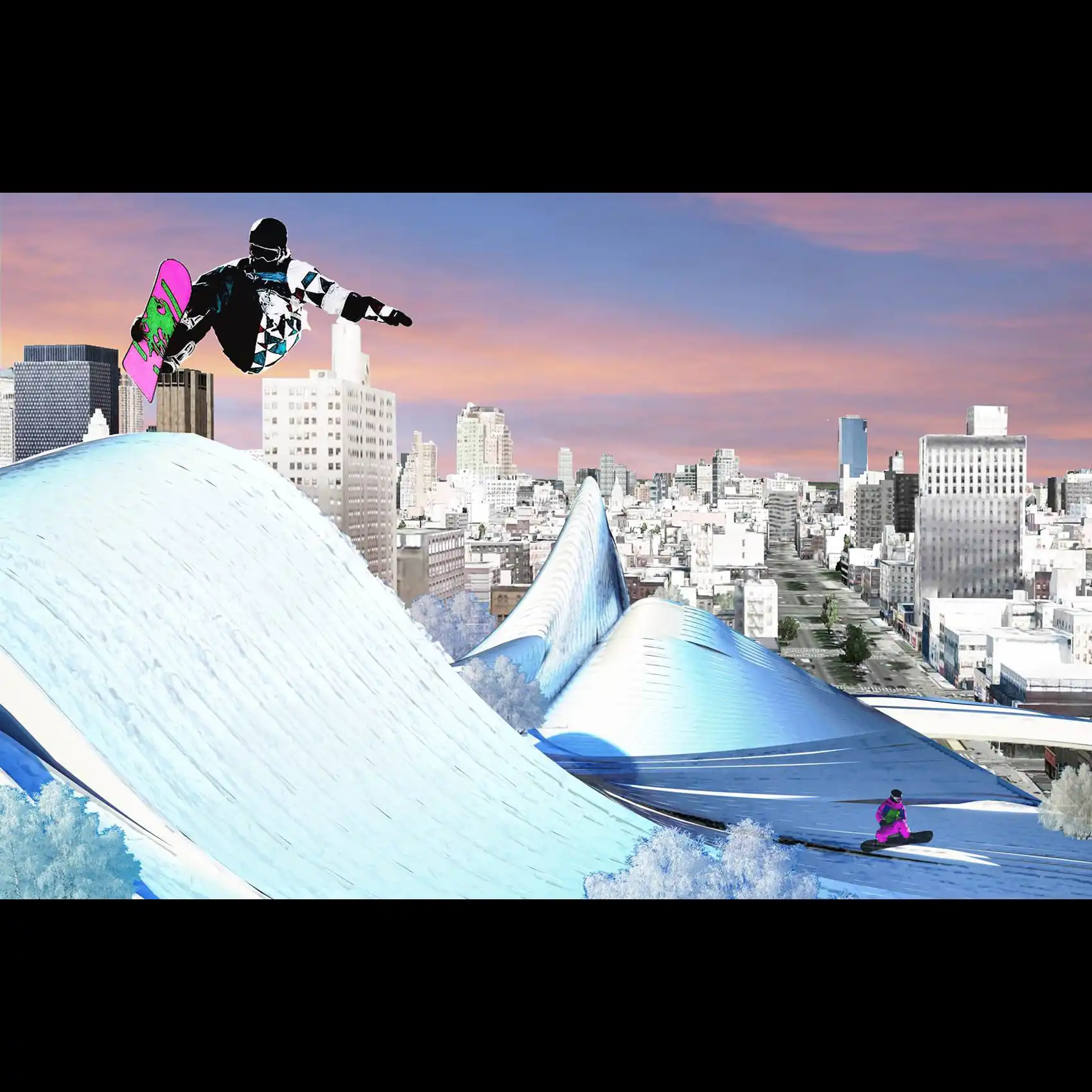 Автор предлагает установить конструкцию гор на крышах супермаркетов. Этот искусственный ландшафт можно использовать зимой для катания на лыжах и сноуборде, а летом для туризма.