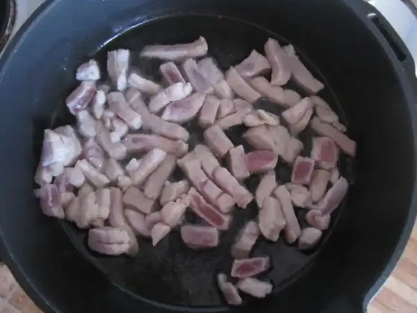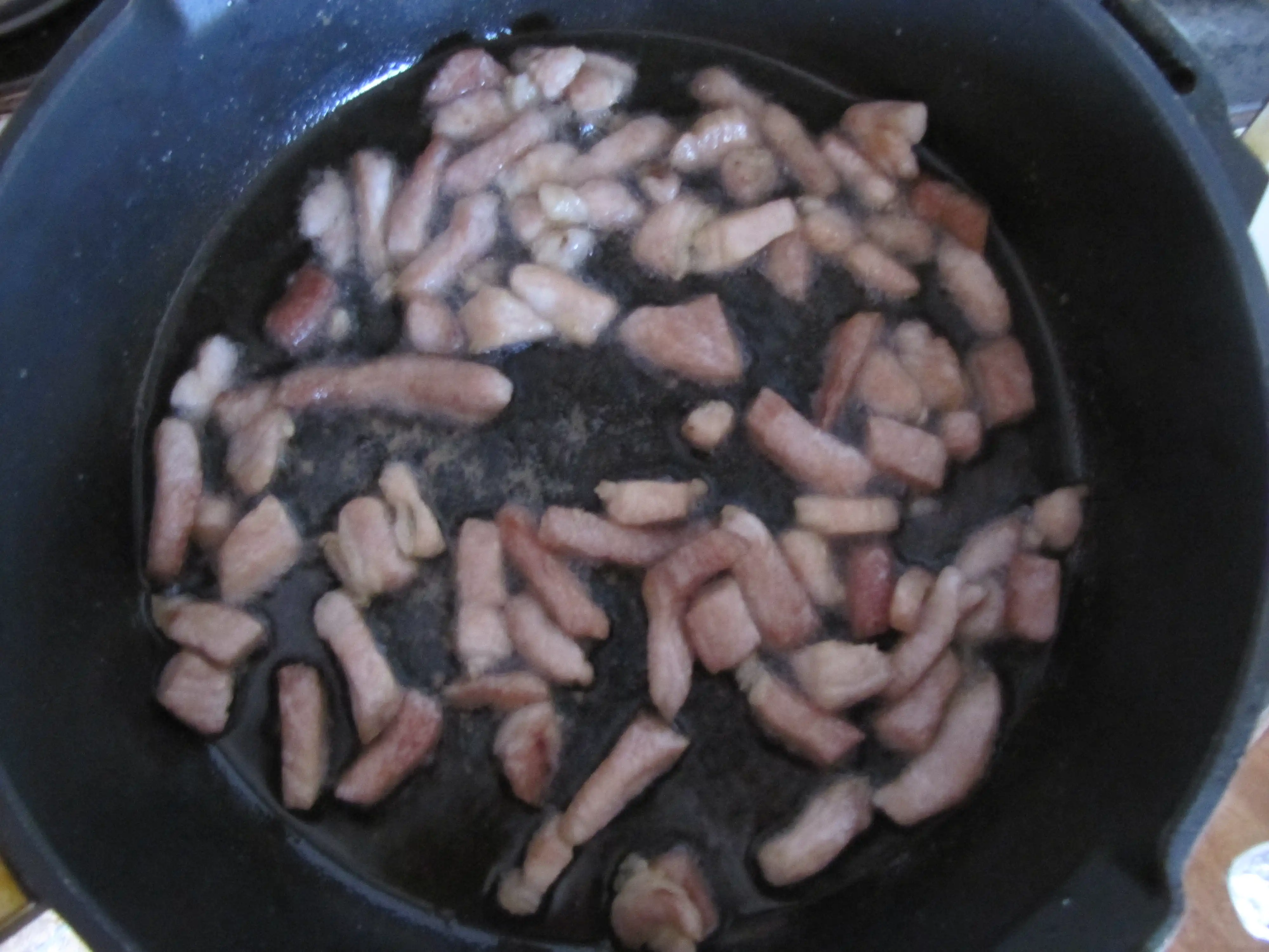 Затем выкладываем мясо в раскаленное растительное масло, перемешиваем, солим, даем потушиться под крышкой пару минут, посыпаем сахаром (1 ч.л.), обжариваем до золотистого цвета.