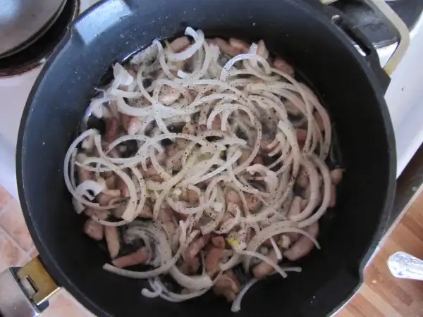 Добавляем порезанный полукольцами репчатый лук, посыпаем черным молотым перцем, даем протушиться пару минут, добаляем пару столовых ложек соевого соуса.