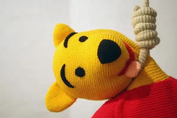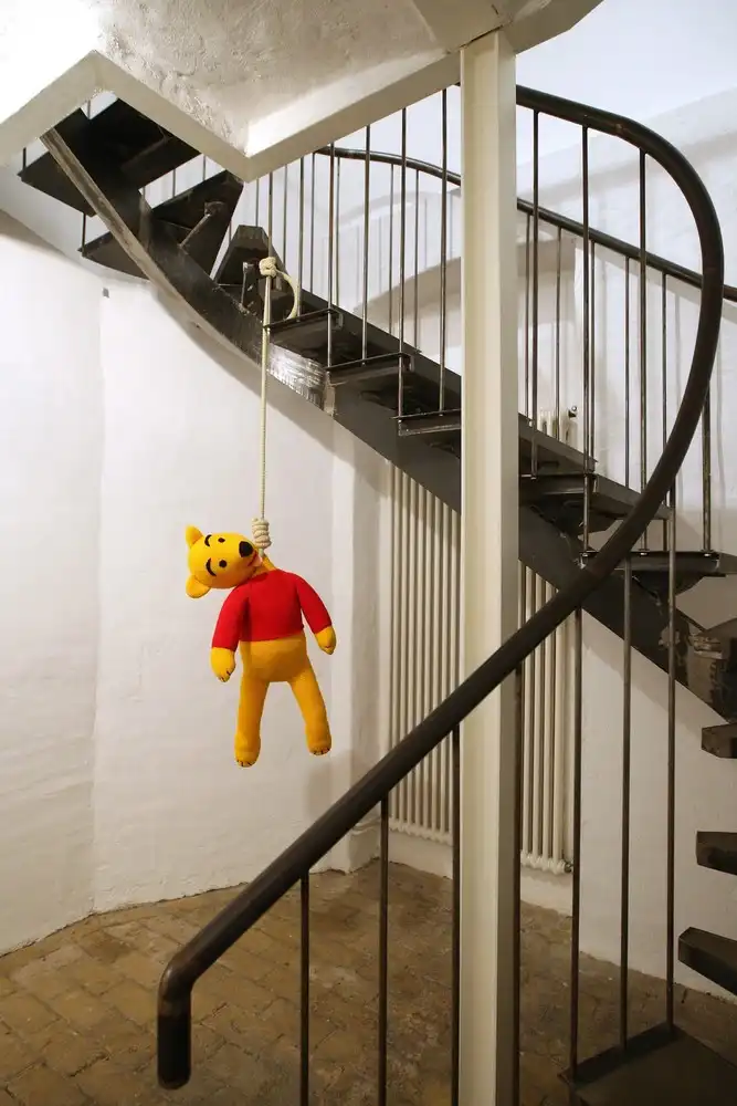 Вязаная скульптура «Винни Пух», превратившая персонажа доброй детской сказки в висельника-самоубийцу.