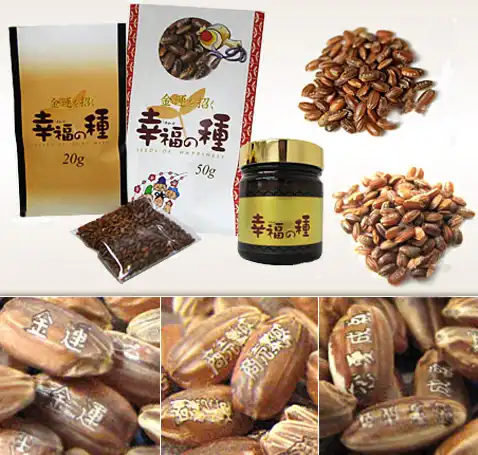 Красный рис с пожеланиями. Внизу примеры пожеланий: «успеха в золоте», «успешной торговли» и «удачи в романтической любви» (фото с сайта arigatou3.com).