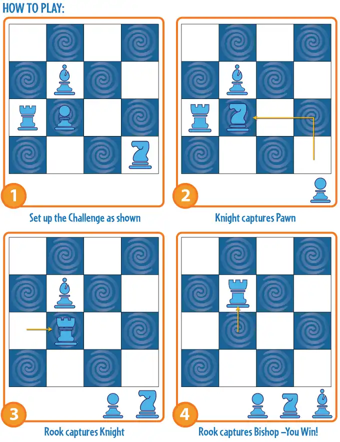 Выбрав одну из карточек, игрок расставляет фигуры согласно рисунку на ней и начинает игру. Цель: передвигая фигуры по правилам обычных шахмат, «съесть» их все кроме одной. Каждый раз ходить может любая фигура, но при этом надо продумать стратегию так, чтобы на каждом шаге всегда «съедать» одну.